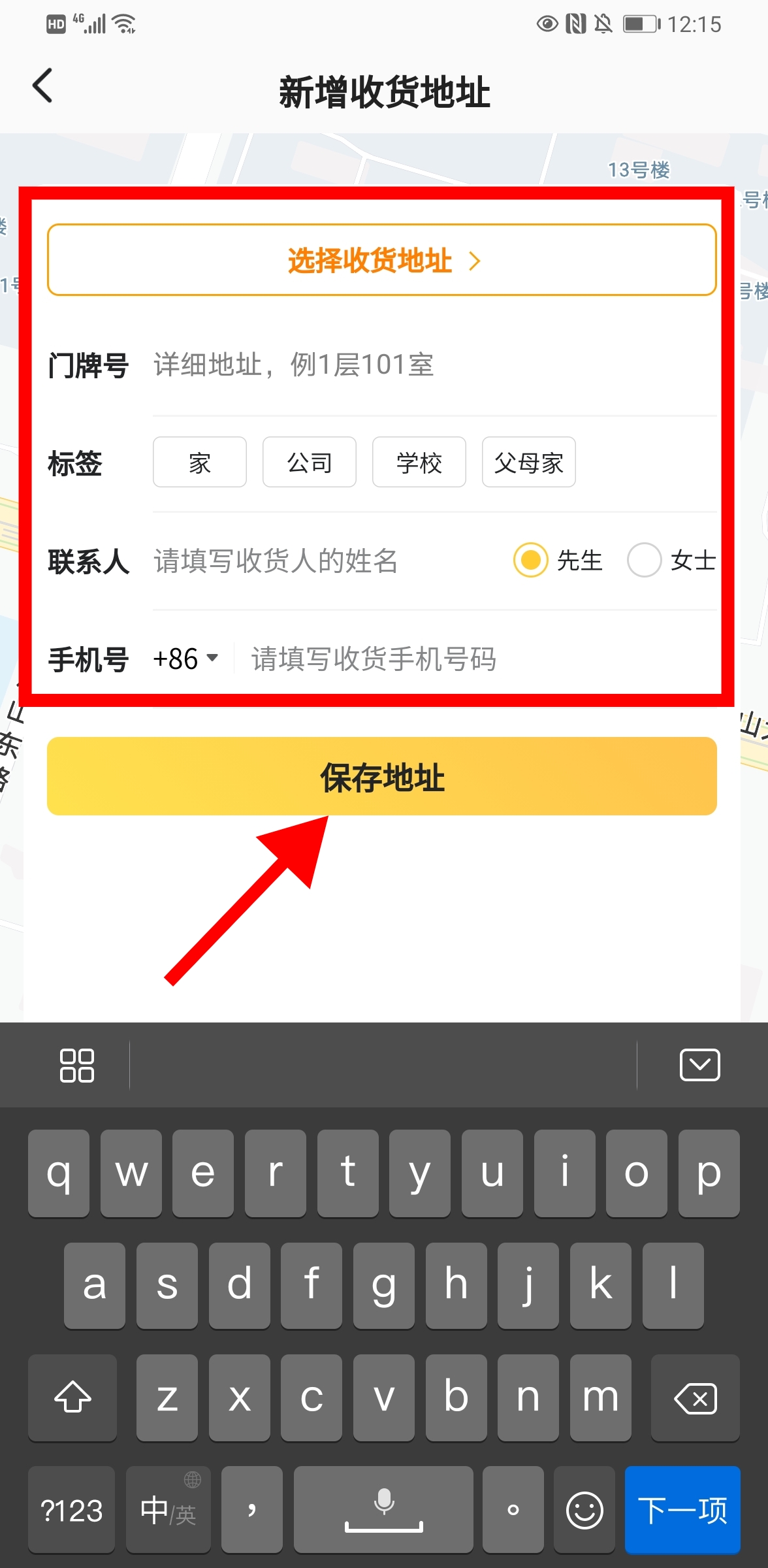 点击过“新增地址”按钮之后,我们就进入到“新增地址”页面,按照格式将自己朋友的地址信息以及联系方式填到规定的位置。填写完之后直接点击下方的“保存地址”按钮