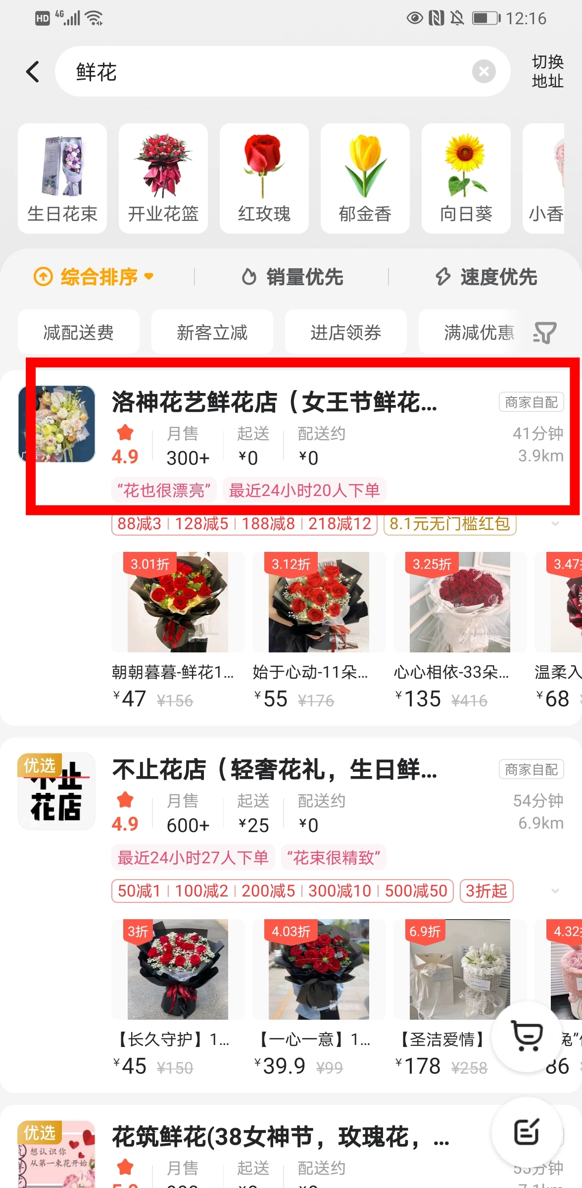 点击过“搜索”按钮之后,我们会直接跳转到很多售卖鲜花的外卖店铺,可以上下滑动,选择自己想进入的店,点击这家店铺的名称,即可进入到该店铺。