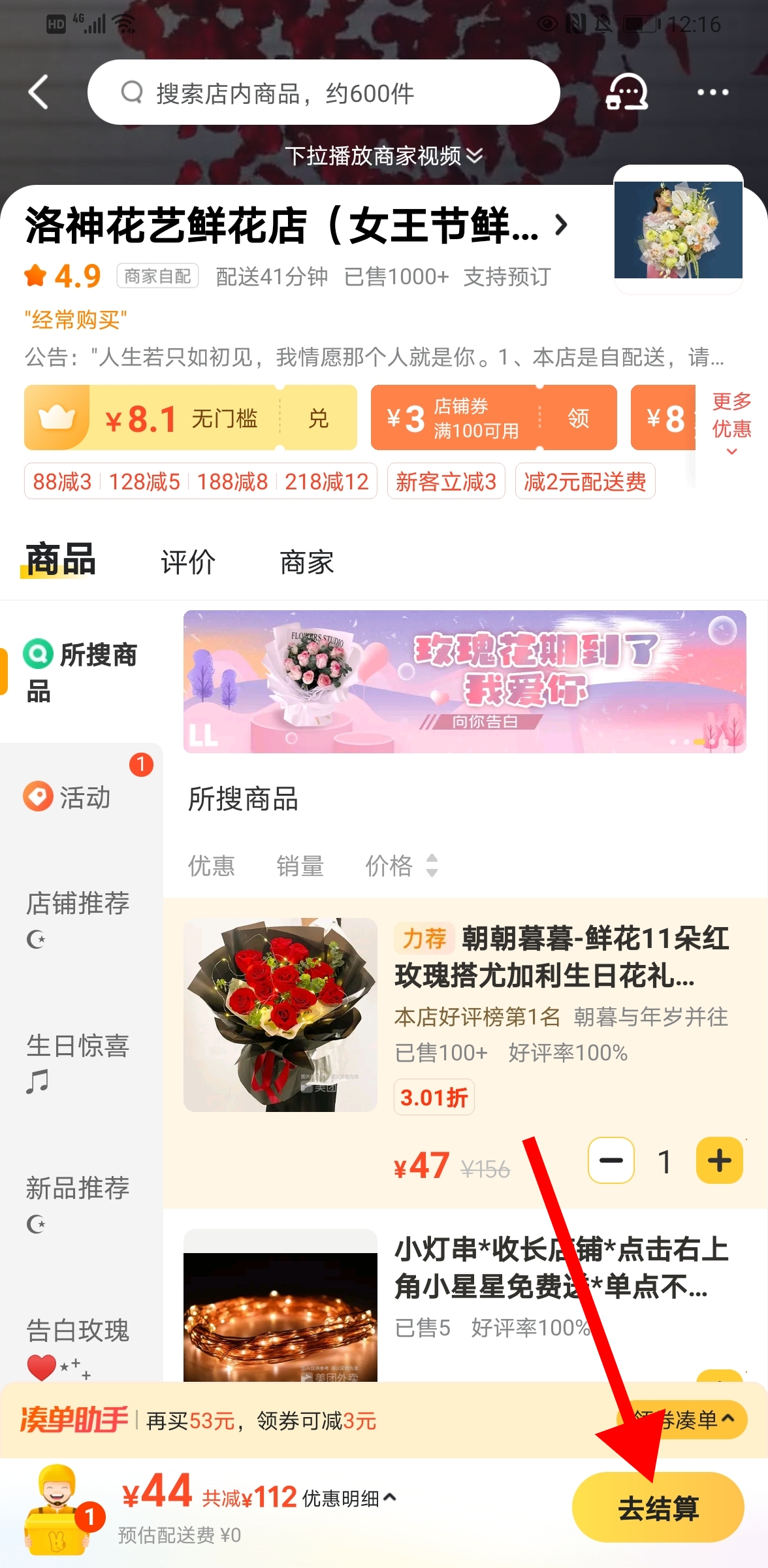 找到送花上门的花店,选择鲜花加入购物车,点击【去结算】。