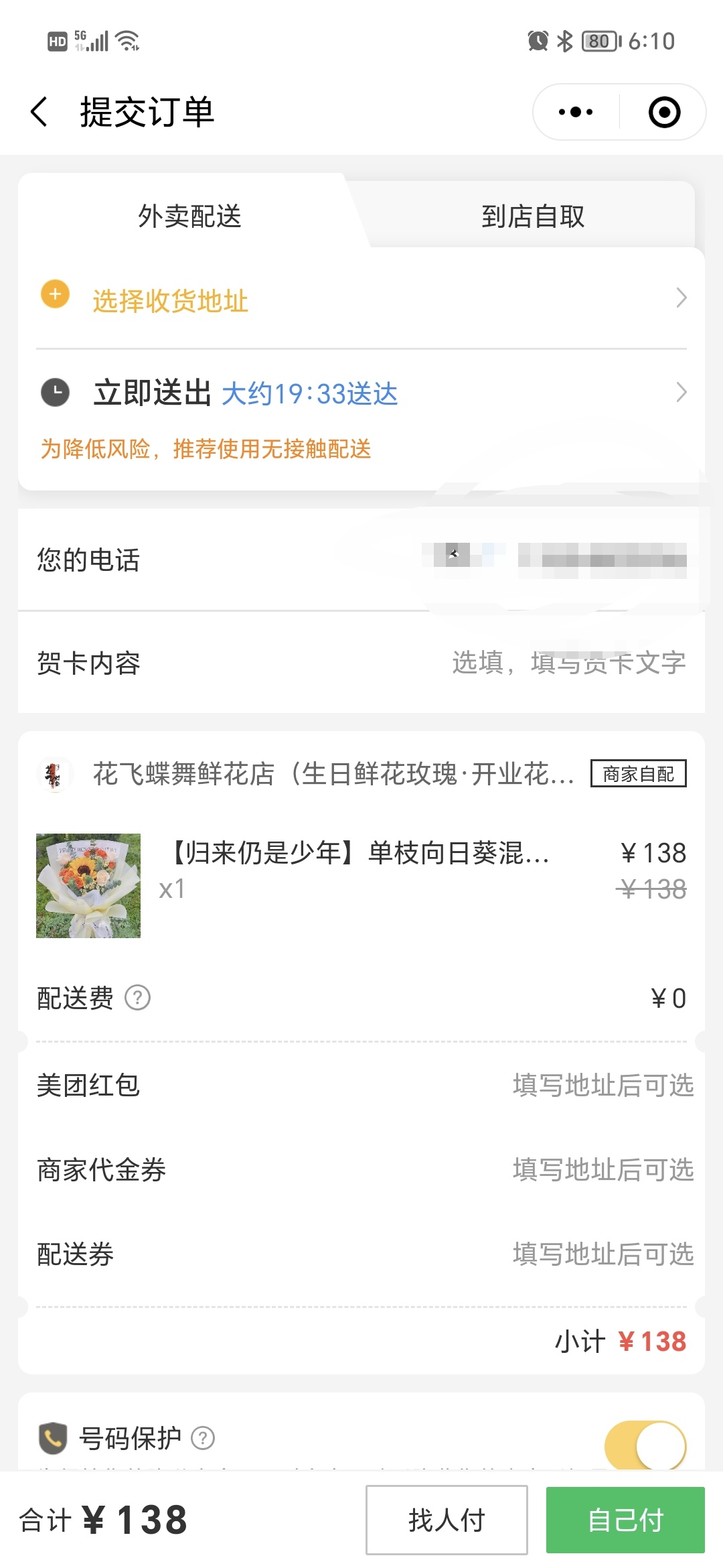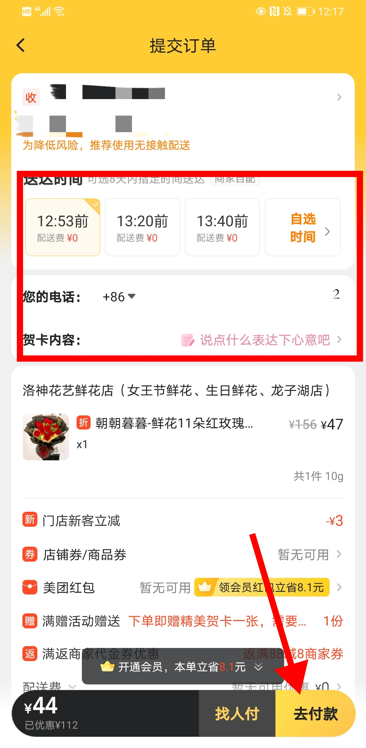 这个时候我们会进入到结算确认页面,我们将需要预留的手机号填写好,把贺卡内容也填写完整,然后就可以直接点击右下角的“去付款”功能按钮