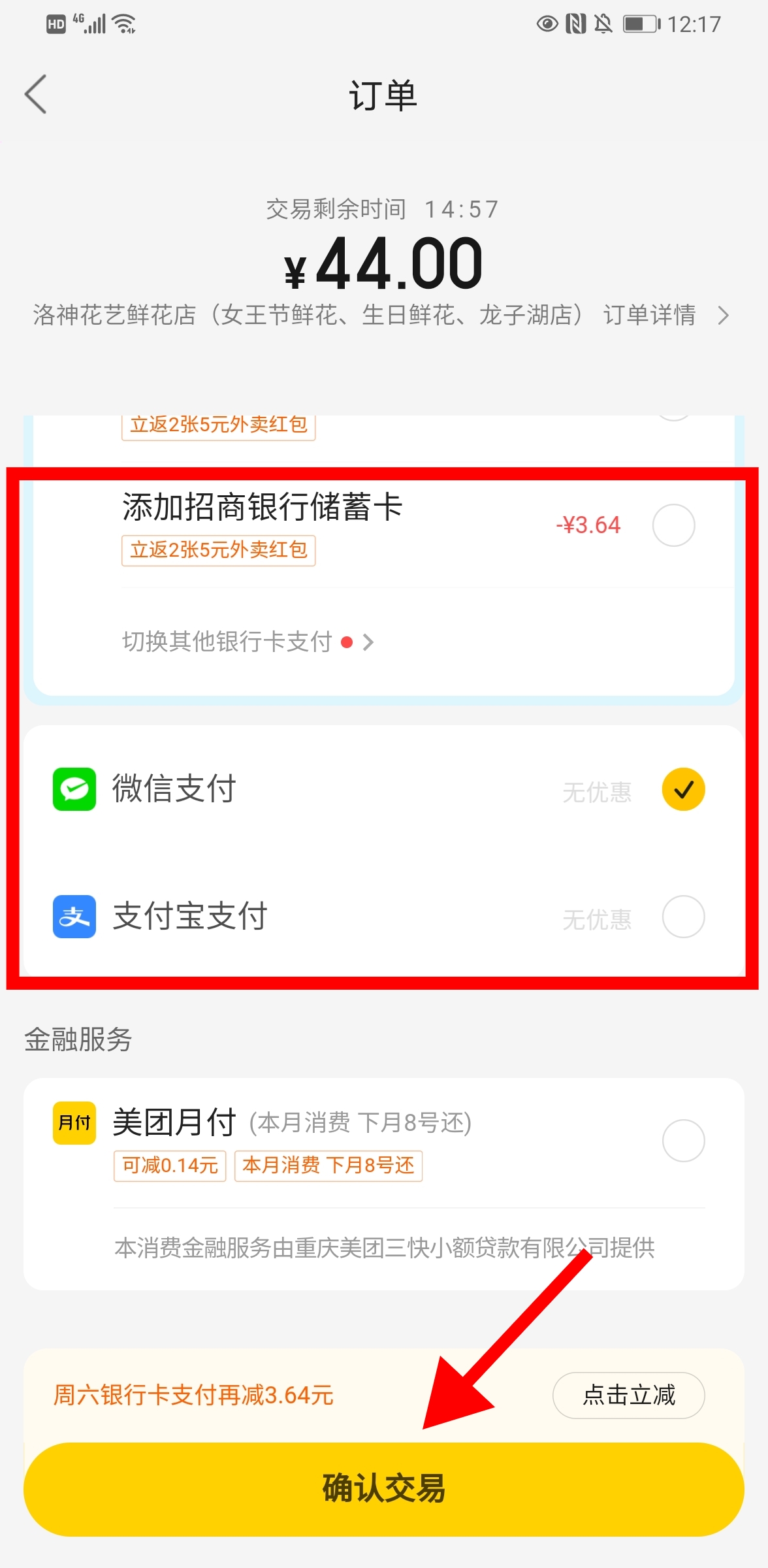 我们就直接来到了结算的页面,我们根据自己的需要,选择自己想用的付款方式,在下图红色框内即可选择自己想用的付款方式。选择完成之后,直接点击下方的“确认交易”功能按钮,操作完成以上所有步骤即可实现在美团给异地朋友订鲜花的目的。