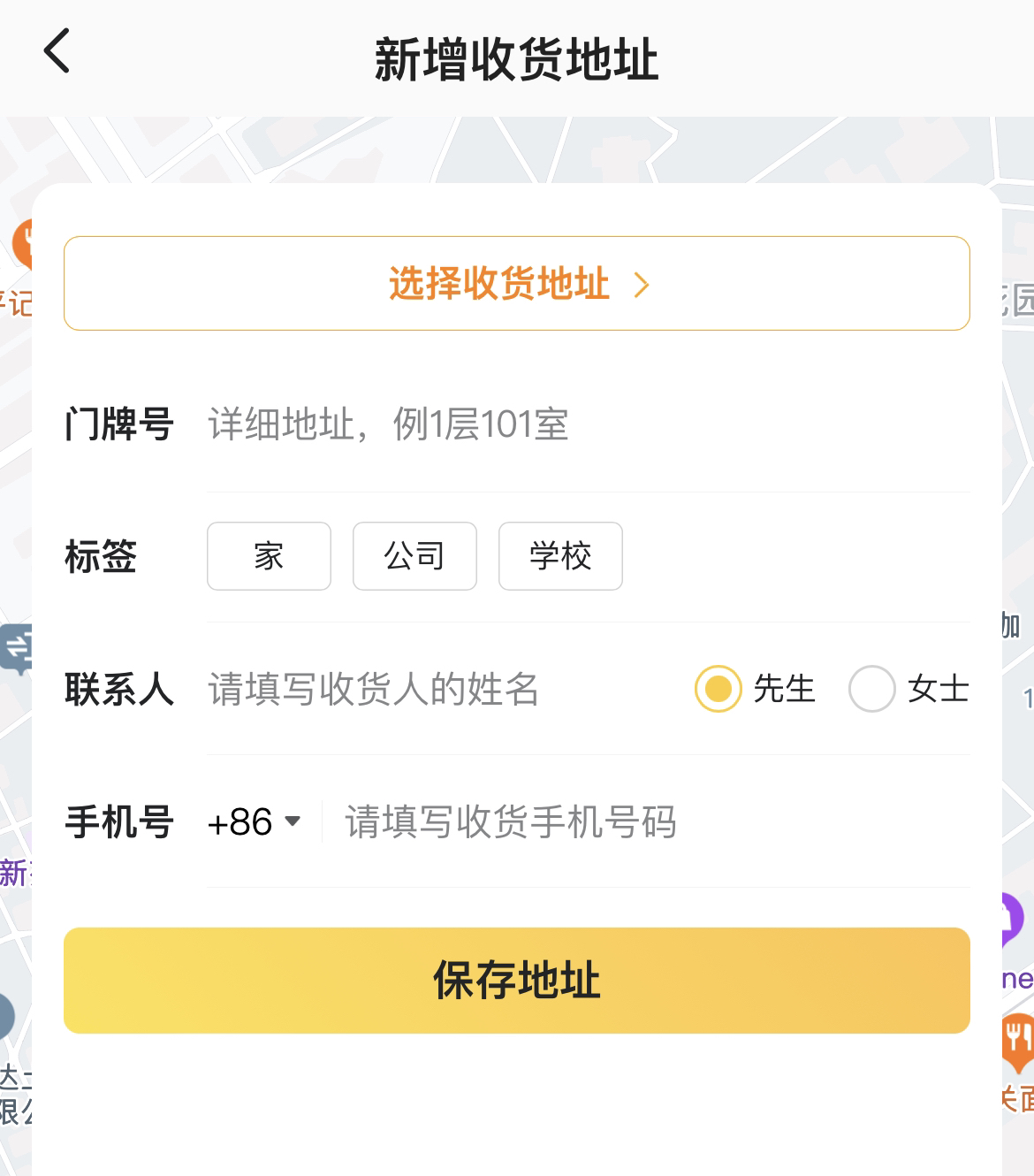 进入到外卖地址页面之后,点击右上角的“新增地址”按钮