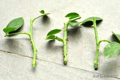 枝条的选择。尽量选择半木质化的枝条,剪成5~8厘米的小段,底部一端记得切成斜角,切口要平整,不然不利于生根。颈部留2~3片叶子,用多菌灵溶液浸泡20分钟左右,消毒杀菌,防止黑杆!月季扦插很容易黑杆,要格外注意。