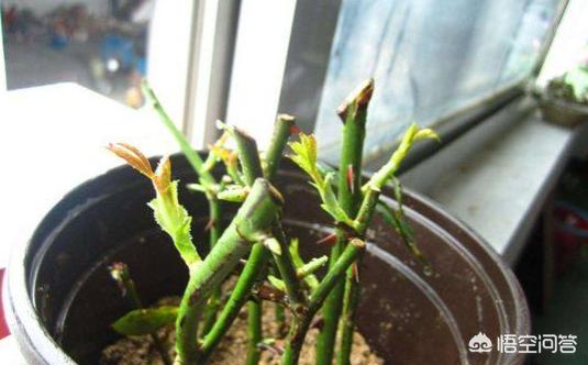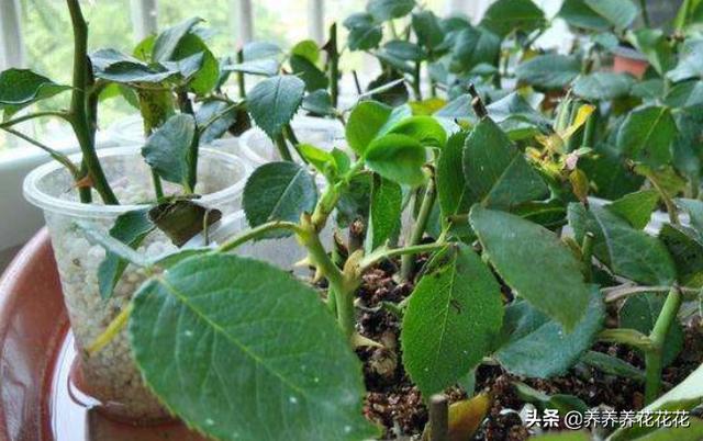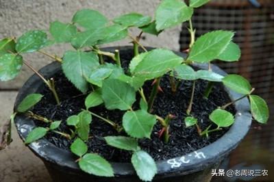 这样放到一个散射光通风好的地方去,保证盆土的湿润,土表干了及时的给它浇透水,不要用太大的盆,如果叶片打蔫,可以每天用喷壶的细喷雾去喷一下叶片,让叶片吸收一下水分,如果温度能够保证在15度以上,我们就会发现,最多一周多的时间,它的芽点就会明显的生长,两周左右的时间,我们就可以把它移栽到新的盆土里去了,因为它的根系已经长得很好了,这就是扦插月季的方法,您学会了,您扦插就能够100%的成活。