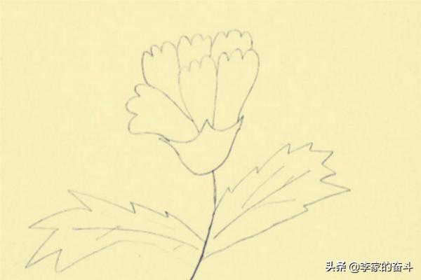 6.在完成的花朵的下面部分我们如图画出萼片部分以及花茎。最后在茎部的合适位置画出康乃馨的叶子。康乃馨的简笔画完成。