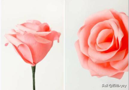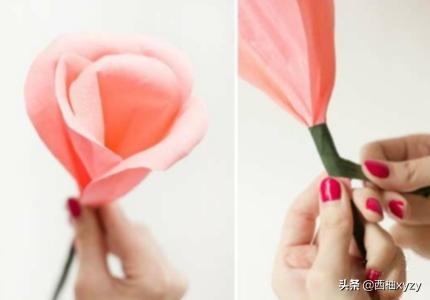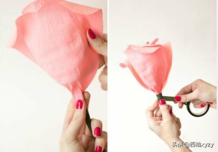 7、现在开始包15片大花瓣,通常每围2片花瓣就用胶带固定一次。每次添加花瓣,都应该稍微旋转让花瓣分布均匀。