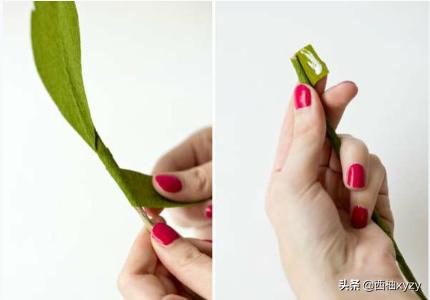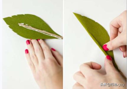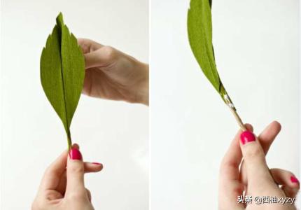 14、另两片叶子重复以上步骤,然后将叶子用胶带粘到茎上,然后稍弯曲叶片向外伸展。
