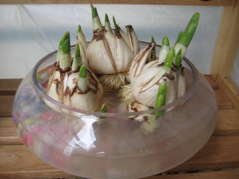 到了时间之后,把种球拿出来放到水培盆里,往水里加入几滴生根液。然后把水培盆放到一个光照供应充足的地方。晚上把水倒掉,到了第二天早上,再加上水。