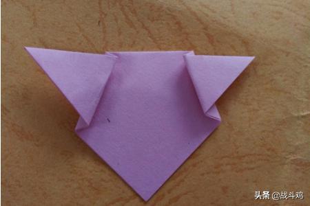 2、把右边的角先向左折一下,再往回一点。同样左边的角先向右折,再向左折,这样小猪的耳朵就出来了。