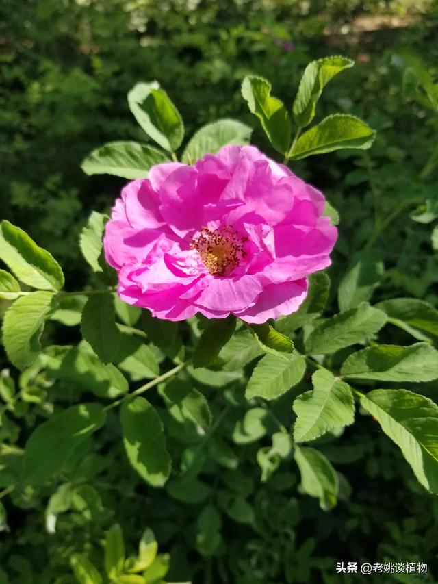 花单生于叶腋或数朵聚生,苞片卵形,边缘有腺毛,花梗长5-25毫米密被绒毛和腺毛,花直径4-5.5厘米,上有稀疏柔毛,下密被腺毛和柔毛;花冠鲜艳,紫红色,芳香;花梗有绒毛和腺体。蔷薇果扁球形,熟时红色,内有多数小瘦果,萼片宿存。